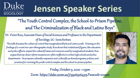 Jensen Speaker Series presents Dr. Victor Rios, Associate Dean of Social Sciences and Professor in the Department of Sociology, UC- Santa Barbara, “The Youth Control Complex, the School-to-Prison Pipeline, and The Criminalization of Black and Latino Boys”